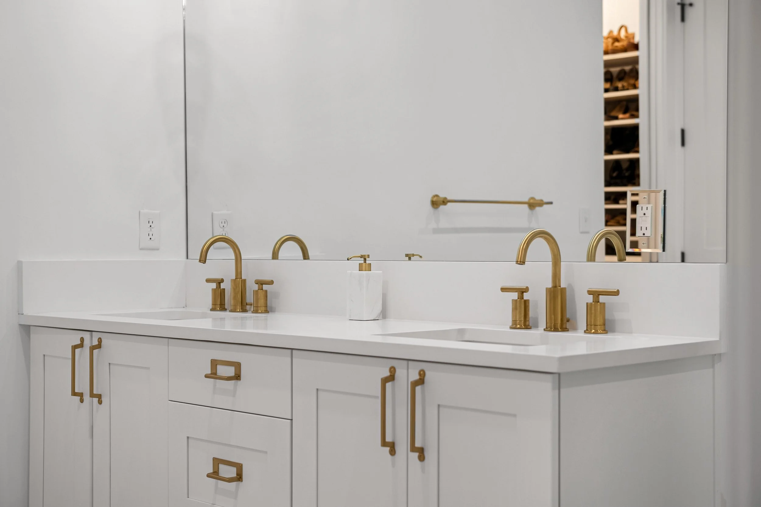 The master retreat features a large walk-in closet and en-suite luxury bathroom with a large stand-alone soaking tub, a walk-in frameless shower, bright white tile, quartz, and striking gold accents.