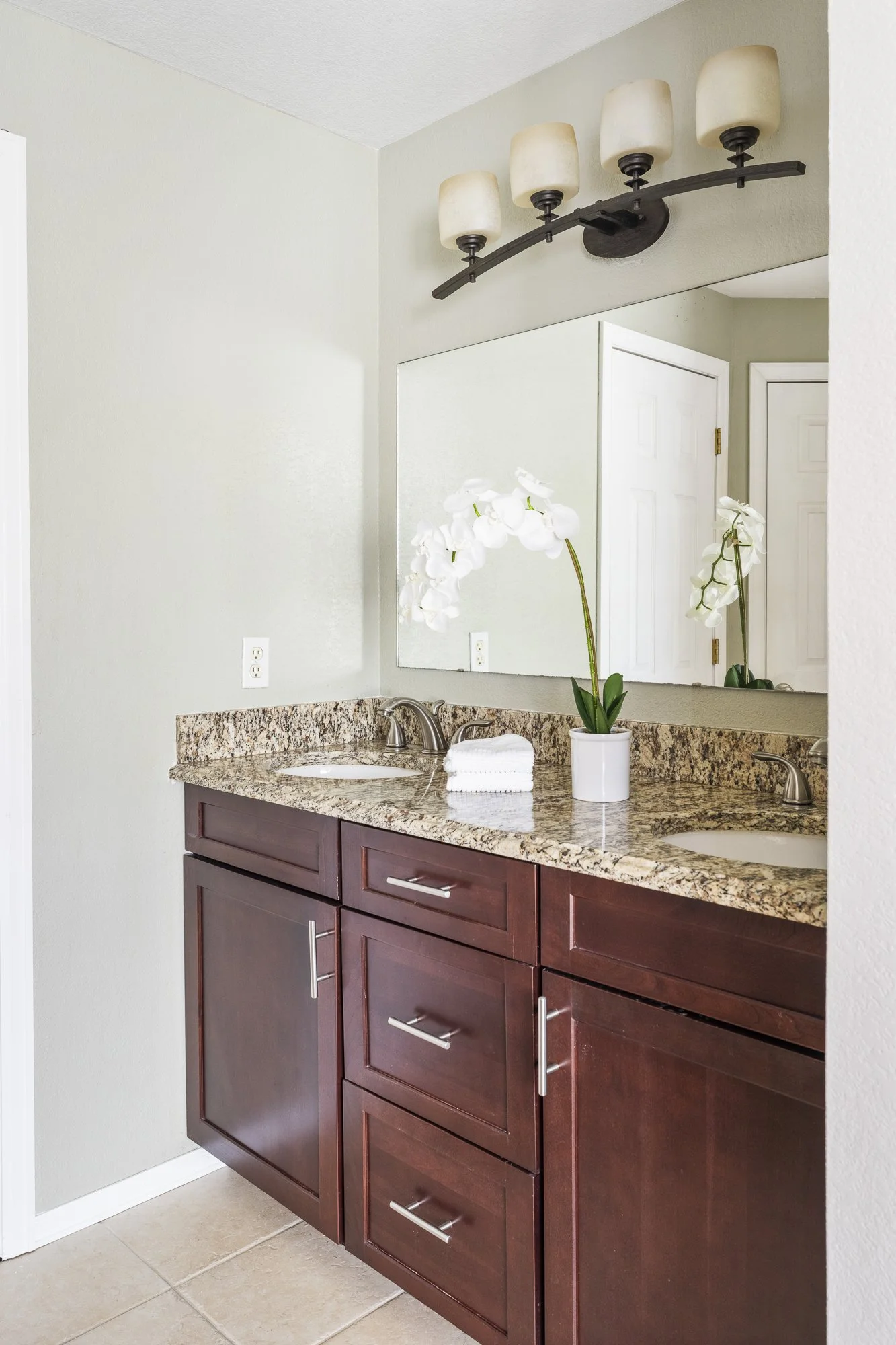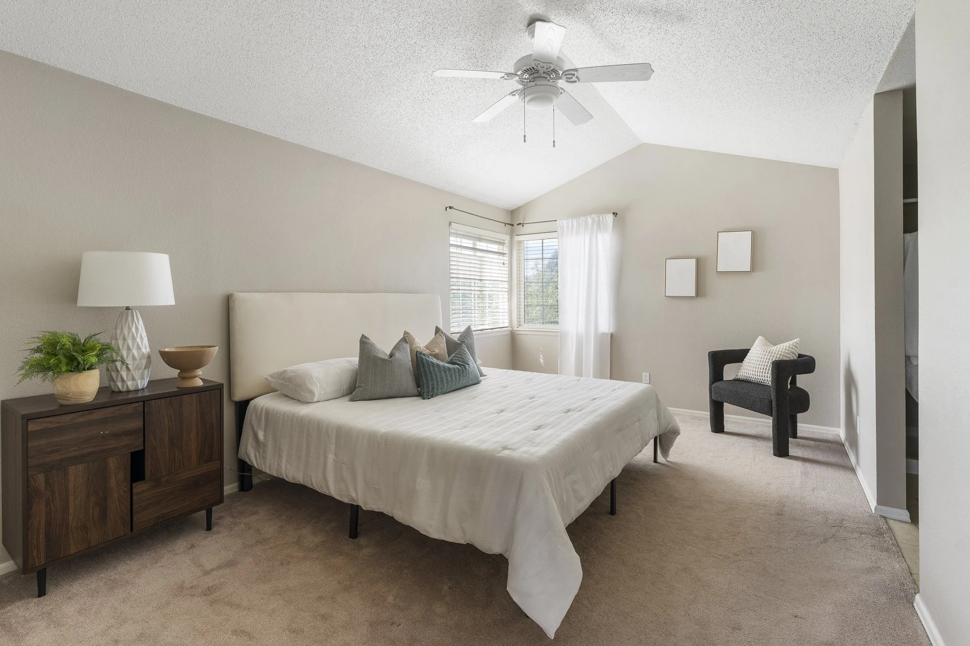 The primary suite provides a relaxing retreat with a vaulted ceiling and a serene bath.